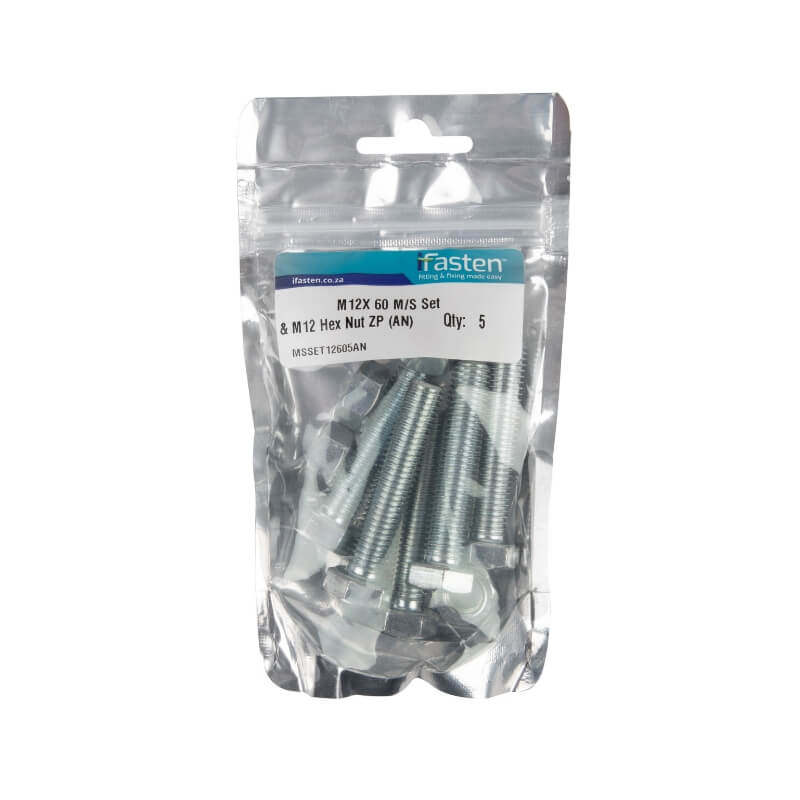 BOLT 60MM & NUT 12MM MILD STEEL ZINC PLATED Q:5 IFASTEN